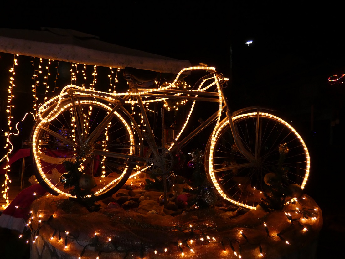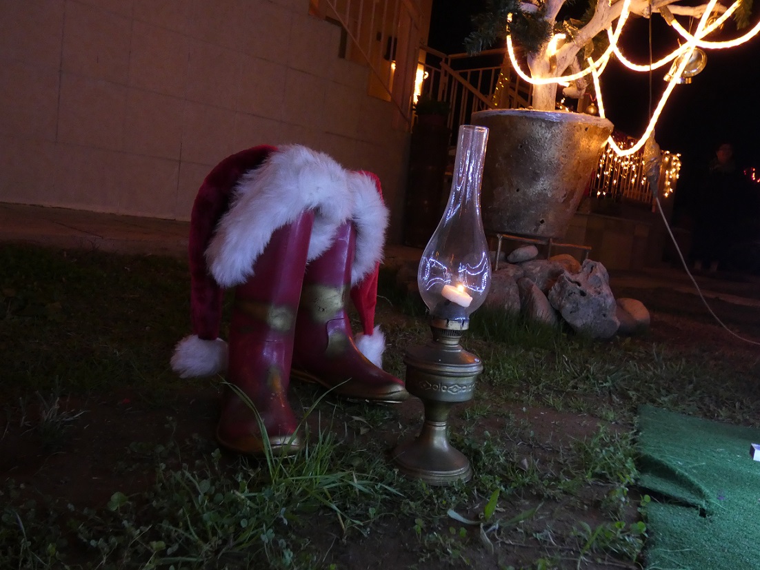 Το έλκηθρο του Αη Βασίλη και οι φιγούρες του ασπρομάλλη παππού κυριαρχούν στο χώρο, τα παλιά ποδήλατα στολισμένα με φωτιστικές γιρλάντες, αψίδες αναρριχητικών με λαμπιόνια, το παλιό πηγάδι και οι βρύσες φωτισμένα, ένα πολύχρωμο καράβι και λαμπιόνια παντού, προσφέρουν ένα φαντασμαγορικό θέαμα!