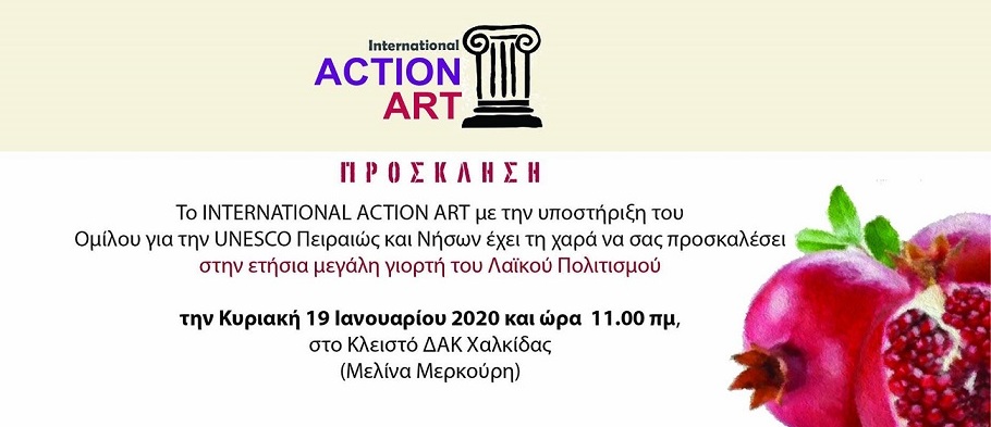 "To INTERNATIONAL ACTION ART με την υποστήριξη του Ομίλου για την UNESCO Πειραιώς και Νήσων έχει τη χαρά να σας προσκαλέσει στην ετήσια μεγάλη γιορτή του Λαϊκού Πολιτισμού την Κυριακή 19 Ιανουάριου 2020 και ώρα 11.00 πμ, στο Κλειστό ΔΑΚ Χαλκίδας (Μελίνα Μερκούρη)