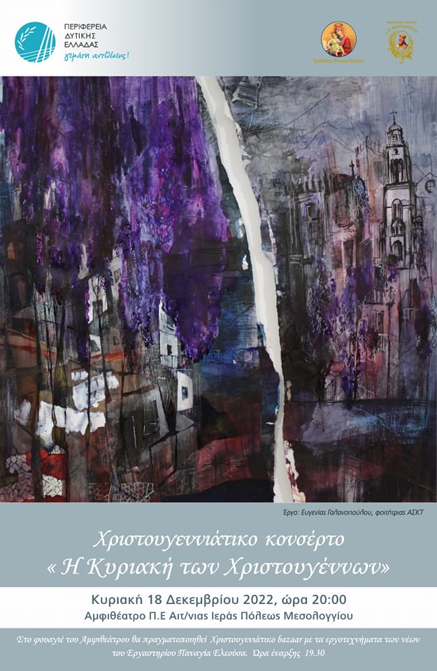 Η Περιφέρεια Δυτικής Ελλάδας και ο Αντιπεριφερειάρχης Πολιτισμού και Τουρισμού, Νικόλαος Κοροβέσης, σας προσκαλούν στο Χριστουγεννιάτικο κονσέρτο, μια εκδήλωση, που έχει ως άμεσο σκοπό την επικοινωνία και τη σύνδεση του ανθρώπου με το Θείο πνεύμα, στο πλαίσιο της χριστουγεννιάτικης μυσταγωγίας και τη συνύπαρξη διαφορετικών πολιτιστικών και θρησκευτικών παραδόσεων.