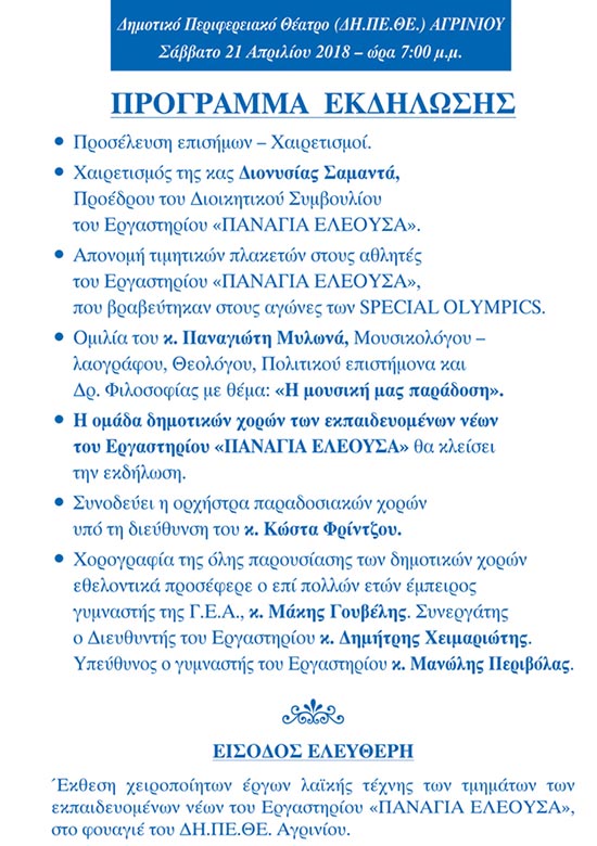 Η Πρόεδρος και τα μέλη του Διοικητικού Συμβουλίου και η Επίτιμη Πρόεδρος του Εργαστηρίου «Παναγία Ελεούσα» Αιτωλοακαρνανίας για άτομα με νοητική υστέρηση & συνοδές αναπηρίες, προσκαλούν σε μουσική εκδήλωση με κεντρικό ομιλητή τον Μουσικολόγο – λαογράφο, Θεολόγο, Πολιτικό επιστήμονα και Δρ. Φιλοσοφίας Παναγιώτη Μυλωνά, με θέμα:«Η μουσική μας παράδοση».