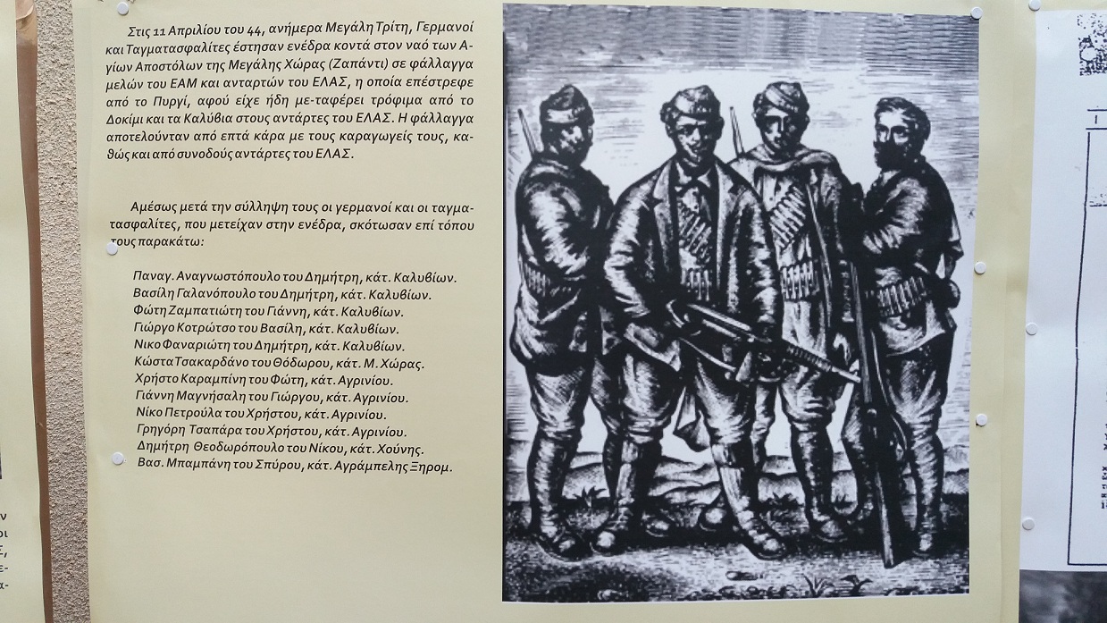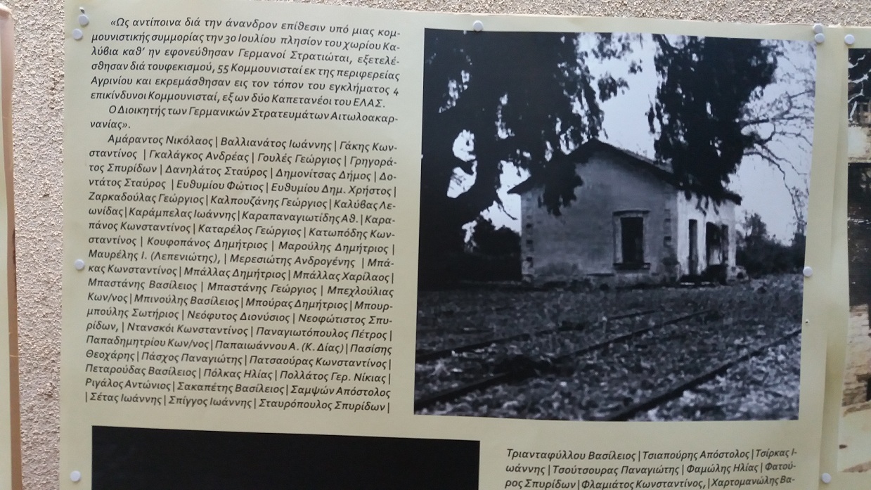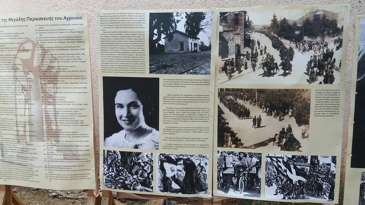 Στην έκθεση ιστορικού υλικού που λειτούργησε στον κήπο της Tράπεζας της Ελλάδας εκτέθηκε ένα συνοπτικό χρονικό της κατοχικής περιόδου, η αντίσταση του τοπικού πληθυσμού, τα αιματηρά γεγονότα με τις μαζικές εκτελέσεις Ελλήνων, στην ηρωίδα Μαρία Δημάδη, καθώς και του 1ου Λαϊκού Δημοτικού Συμβουλίου του Αγρινίου, μέσα από φωτογραφίες και κείμενα, που επιμελήθηκε ο Λ. Τηλιγάδας.
