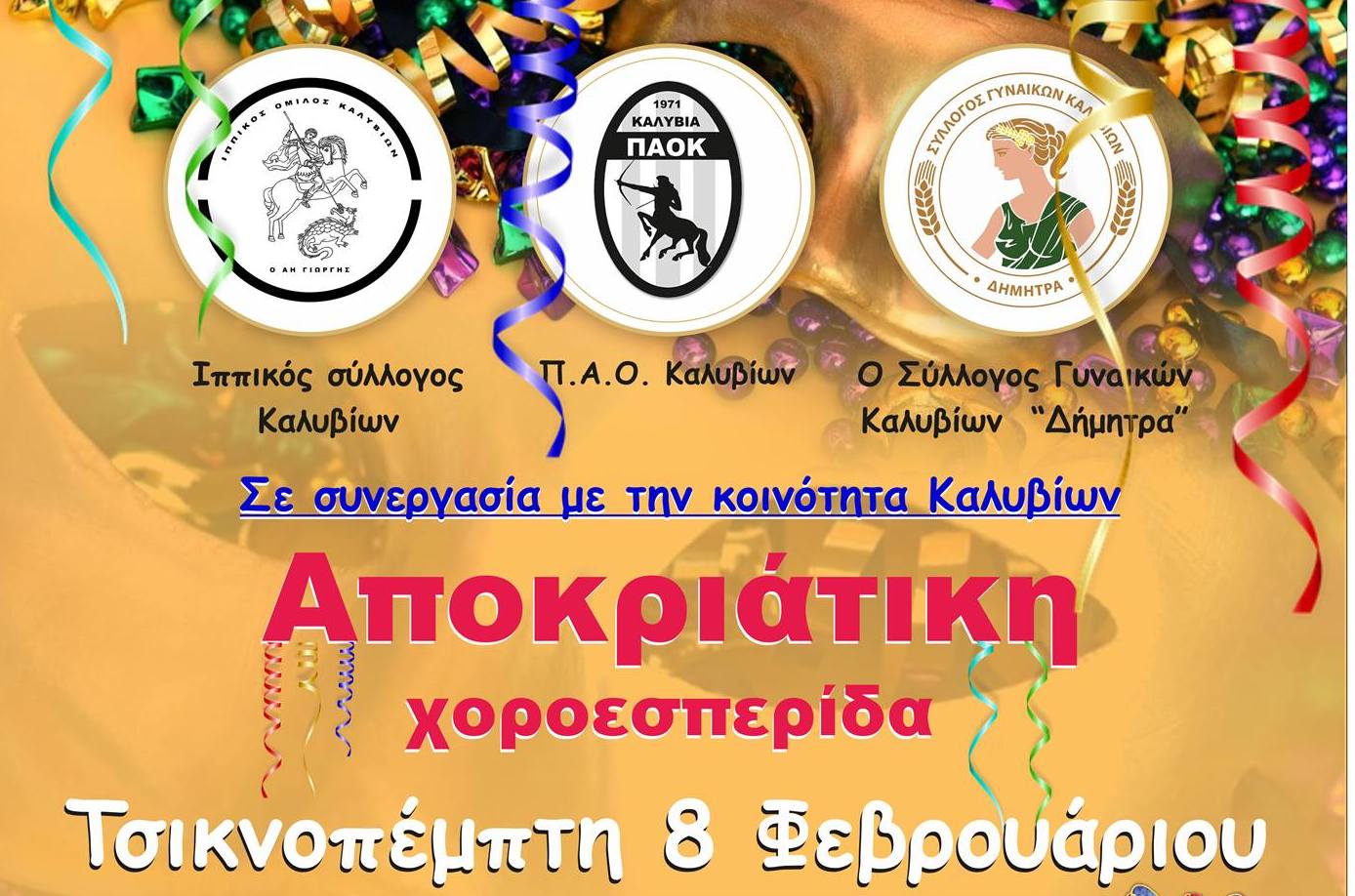 Ο ΠΑΟΚ Καλυβίων, ο Σύλλογος Γυναικών «Δήμητρα», ο Ιππικός Σύλλογος, σε συνεργασία με την Τ.Κ. Καλυβίων διοργανώνουν από κοινού αποκριάτικη χοροεσπερίδα, αύριο Τσικνοπέμπτη, 8 Φεβρουαρίου 2018, στο Emileon.