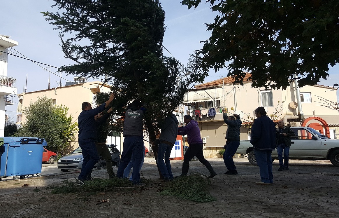 Με την σύμπραξη και την χειρωνακτική εργασία συγχωριανών μας, έγινε σήμερα στην Κεντρική Πλατεία των Καλυβίων η τοποθέτηση του Χριστουγεννιάτικου Δέντρου στη θέση του, όπου σημειωτέον, εκτός από το βάρος του, που δυσκόλεψε τις προσπάθειες ανύψωσης, το ύψος του φθάνει ή ξεπερνά τα 5 μέτρα!