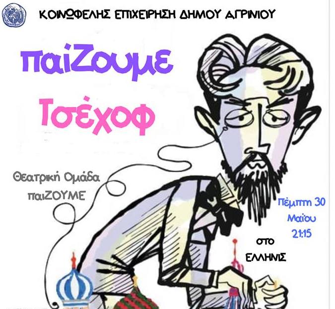 Η Θεατρική ομάδα ενηλίκων "παιΖΟΥΜΕ" της Κοινωφελούς Επιχείρησης Δήμου Αγρινίου, παρουσιάζει την παράσταση "ΠαίΖουμε Τσέχοφ" την Πέμπτη 30 Μαΐου στο "ΕΛΛΗΝΙΣ" στις 21:15.
