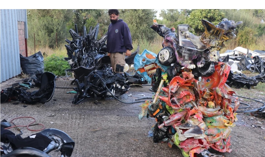 Στο υπαίθριο εργαστήριό του στον Πλάτανο Καλυβίων Αγρινίου, ανάμεσα σε χωράφια με ελιές, ο Θωμάς Διώτης συνθέτει τα πιο ετερόκλητα αντικείμενα που βρέθηκαν στον δρόμο του – φανάρια οχημάτων, αεροδυναμικά φτερά από προφυλακτήρες, εκατοντάδες πλαστικές καρέκλες, πολύχρωμα παιχνίδια, στραπατσαρισμένα ποδήλατα.