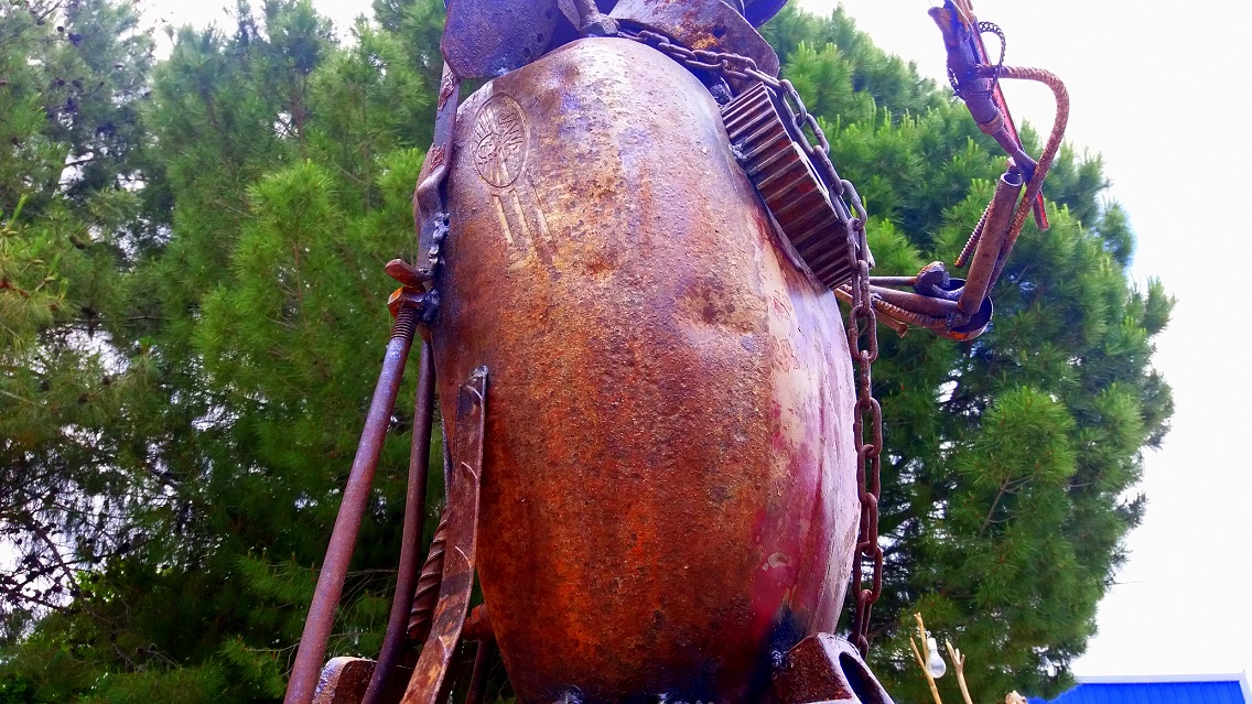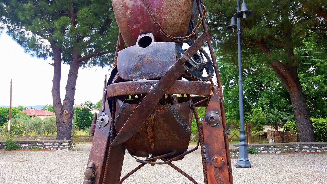 Ο Δημήτρης Μαλεσιάδας, ¨διάλεξε¨ τα υλικά του ανάμεσα στα σκουριασμένα εξαρτήματα από μηχανή Jawa, όπως ένα ντεπόζιτο βενζίνης και ρουλεμάν από τον κινητήρα, γρανάζια, φτυάρι, τσάπα, κάβουρας, πέταλα και βίδες, ένα μαχαίρι, παλιά κομμάτια από σίδερα για τα χέρια και τα πόδια, έναν μεταλλικό άξονα ρόδας από καρότσι το οποίο χρησιμοποιήθηκε για να συγκρατεί τον κορμό της κατασκευής και μια ασφάλεια ηλεκτρισμού για την κεφαλή…