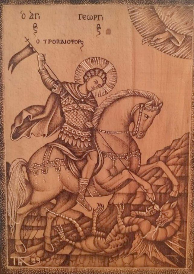 Άγιος Γεώργιος, (Πυρογραφία σε ξύλο οξιάς)