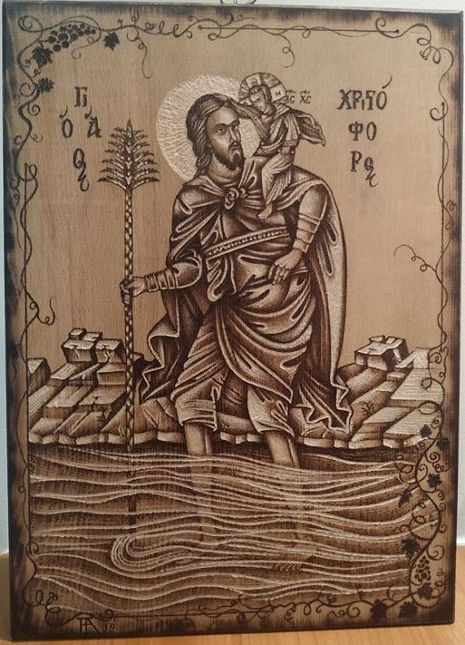 Άγιος Χριστόφορος,ο πολιούχος της πόλης καταγωγής μου, το Αγρίνιο.Πυρογραφία σε ξύλο οξιάς 30x40