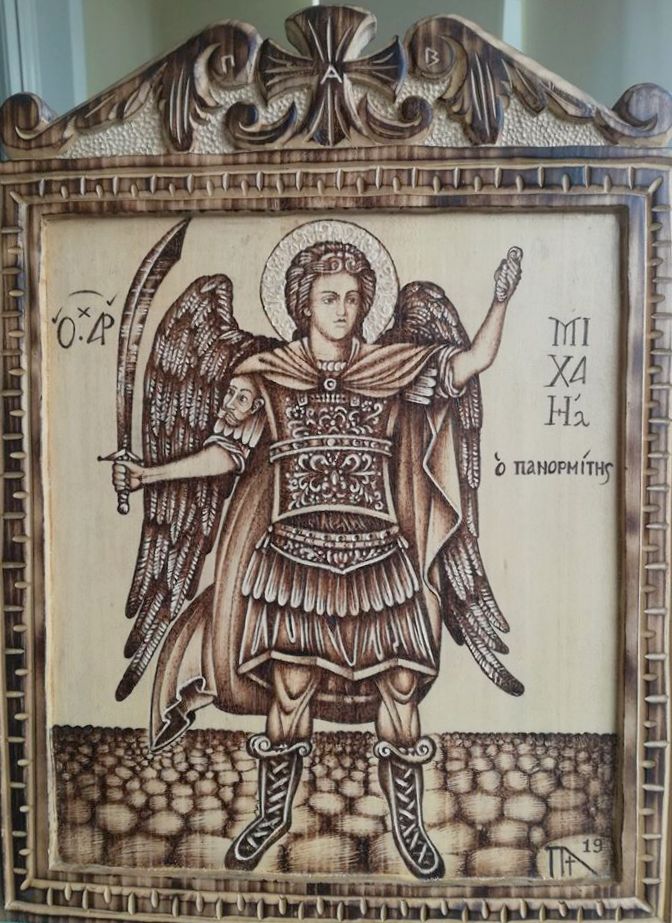 Τα τελευταία δύο χρόνια πήρα έναυσμα από τον επικείμενο ερχομό του γιού μου, του Θανάση και άρχισα να καίω ένα ξύλο για να φτιάξω μια εικόνα για την κούνια του (έφτιαξα τον Αρχάγγελο Μιχαήλ τον Πανορμίτη). Δημοσιεύοντας την εικόνα στο facebook, από τα σχόλια και τα προσωπικά μηνύματα διαπίστωσα ότι, η πυρογραφία και ταυτόχρονα αγιογραφία στην Ελλάδα είναι σε ¨πρωτόγονο¨ στάδιο.