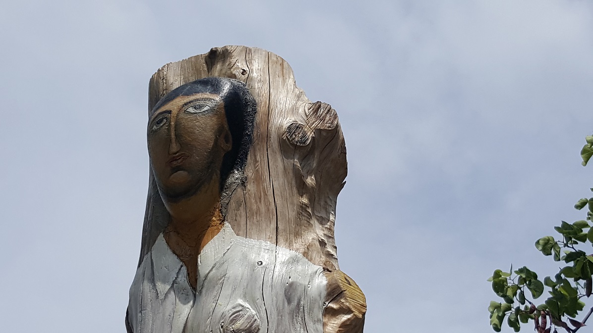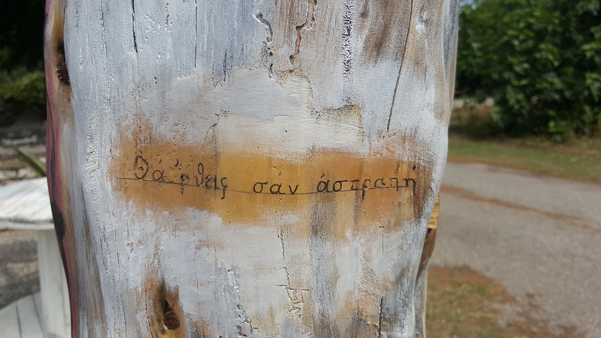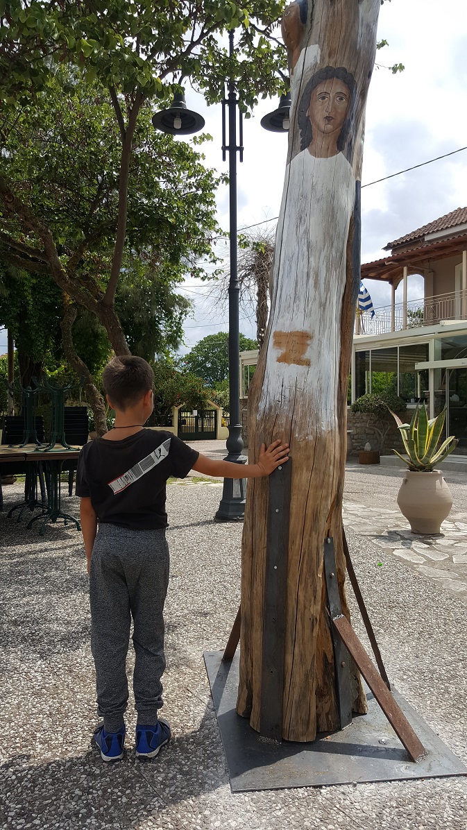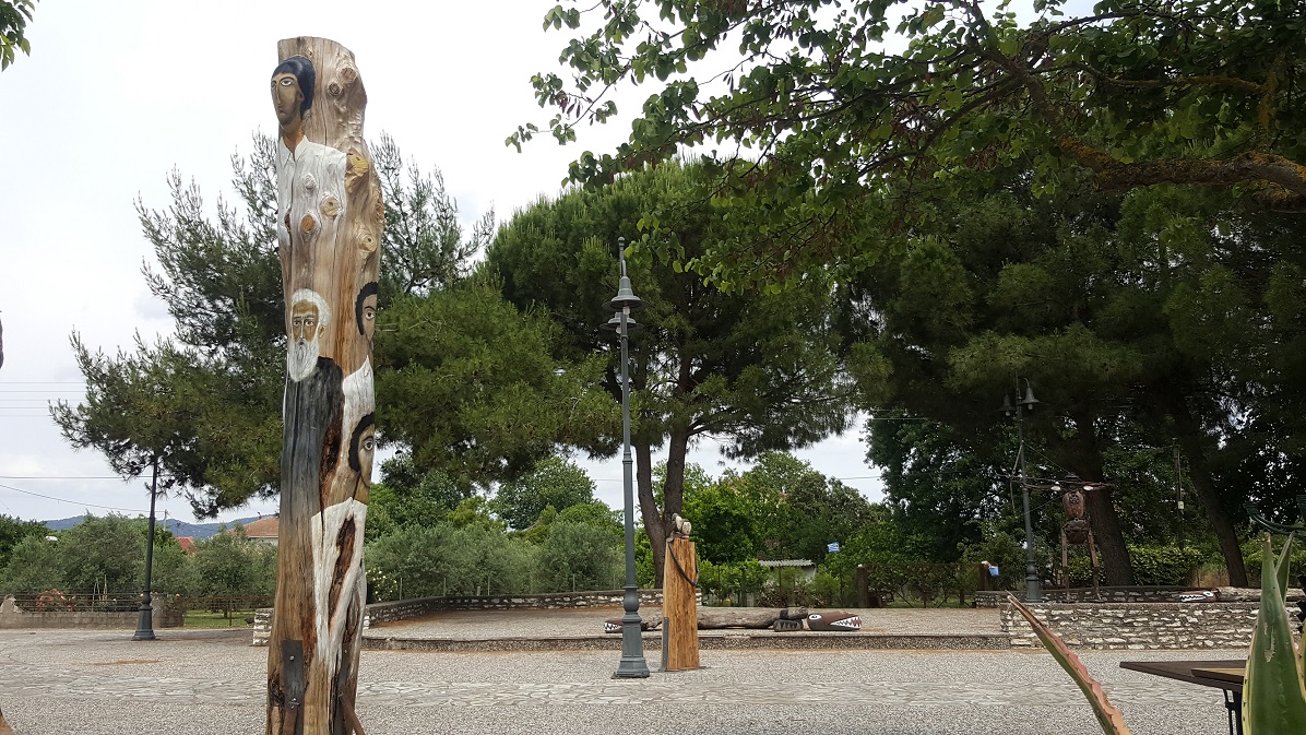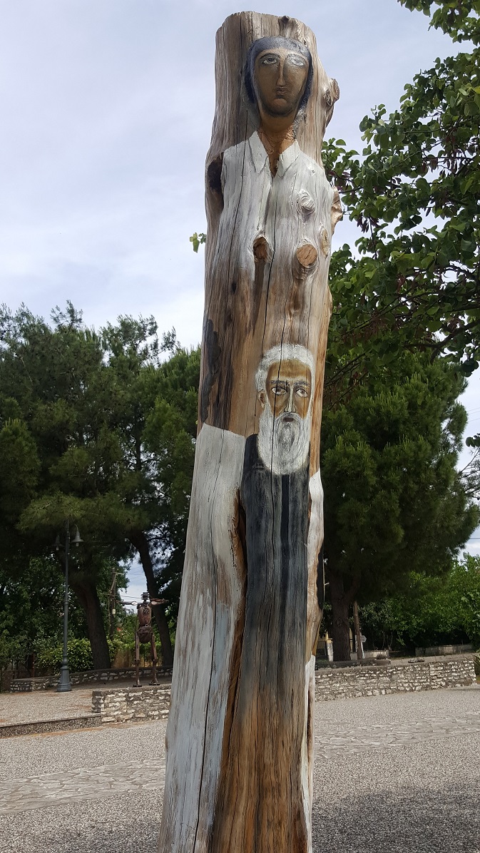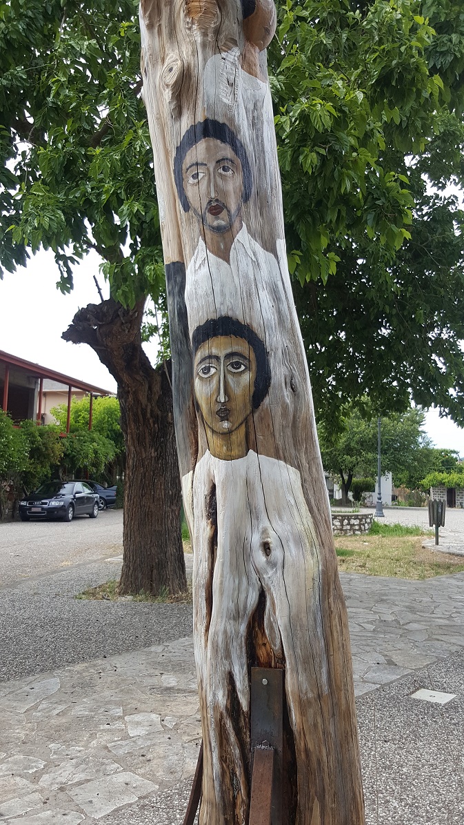 Το πρώτο είναι μια σύνθεση προσώπων φαγιούμ ολόγυρα στον κορμό, σχεδόν αγιοποιημένα, με τίτλο «Βυζαντινή Εγκαρτέρησις» ενώ πιο πέρα στέκεται όρθιο ένα άλλο ξύλινο γλυπτό με τίτλο «Θα΄ ρθεις σαν αστραπή» το οποίο απεικονίζει το πρόσωπο του «Μαρμαρωμένου Βασιλιά» με τα χέρια σηκωμένα προς τον ουρανό και τον λαϊκό θρύλο να ξαναζωντανεύει!