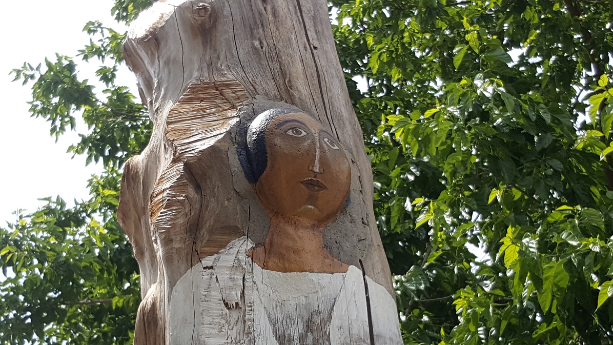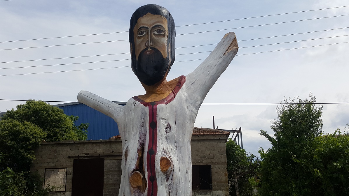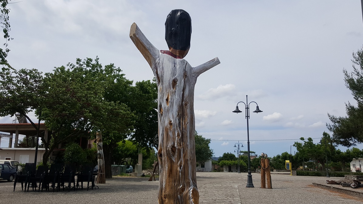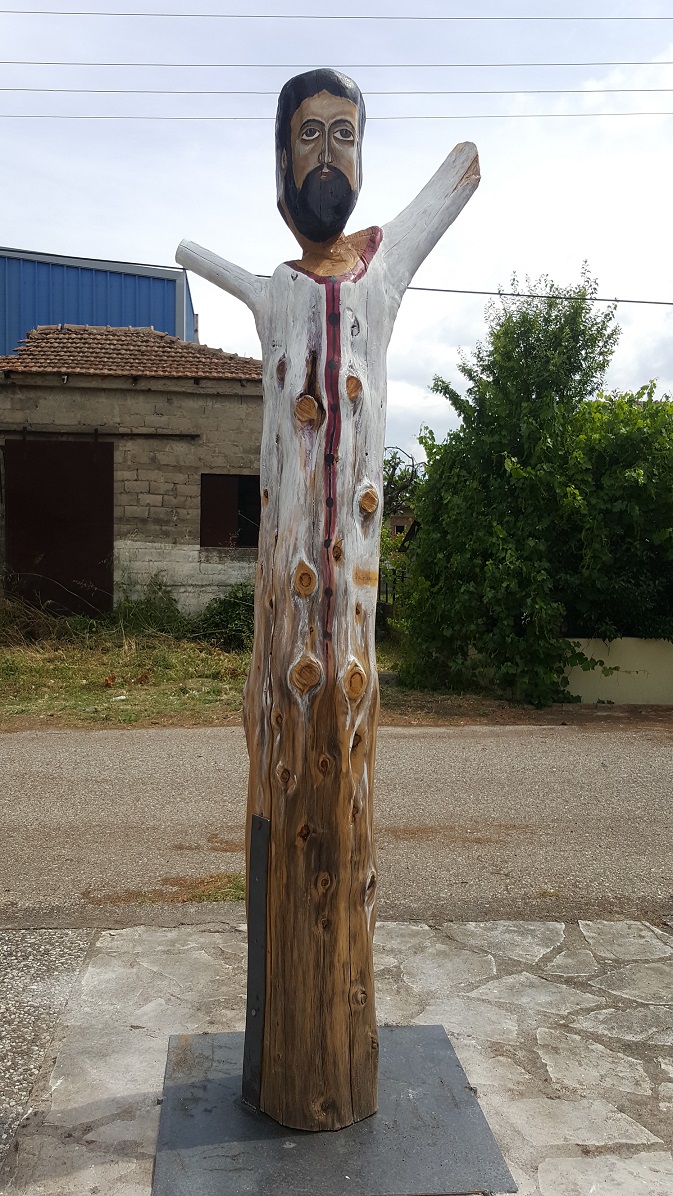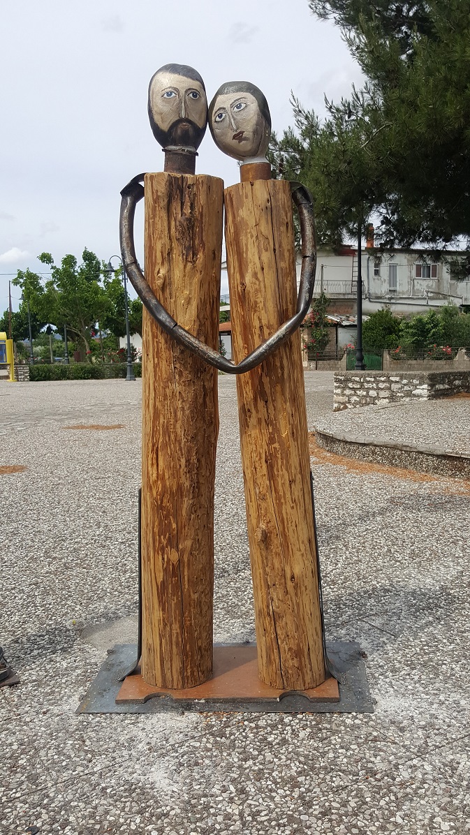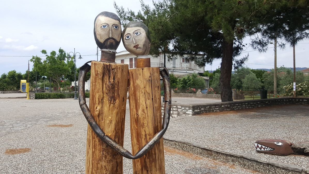 Φτιαγμένα με αγάπη, πολύ προσωπικό κόπο και μεράκι από τον αυτοδίδακτο καλλιτέχνη, τα δυο ογκώδη γλυπτά (3,5 και 2,5 μ. αντίστοιχα) είναι κατασκευασμένα από κορμό κυπαρισσιού, ζωγραφισμένες ποταμίσιες πέτρες για τα πρόσωπα, μπογιές για την υπόλοιπη εικαστική σύνθεση, καθώς και από μεταλλικές βάσεις που τα στηρίζουν.