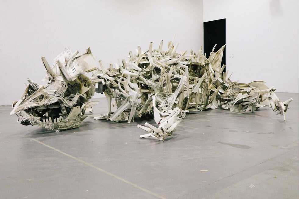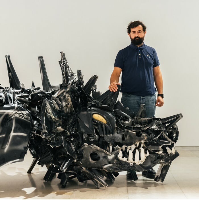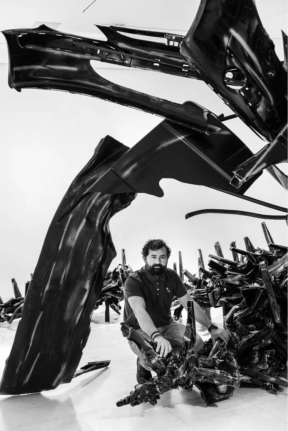 Το νέο εντυπωσιακό έργο του, ένας μαύρος δράκος ακόμα μεγαλύτερης κλίμακας από αυτήν του δεινόσαυρου, φτιαγμένος από 1.500 σπασμένες καρέκλες, προφυλακτήρες αυτοκινήτων και φανάρια, παρουσιάζεται μαζί με μικρότερου μεγέθους γλυπτά του και σχέδια με μορφές καθοδηγούμενες από τη ροή του μελανιού που ακροβατούν μεταξύ της ζωολογικής πραγματικότητας και του κόσμου των συμβόλων. Στο ραντεβού μας στην γκαλερί ήρθε αργοπορημένος και αγχωμένος, γιατί οι ρυθμοί της πόλης και η κίνηση στους δρόμους τον αποδιοργανώνουν.