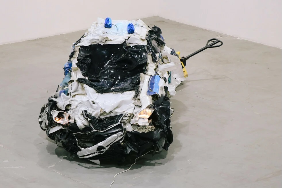 Δεν κάνω τίποτα στην τύχη. Και στην πτυχιακή μου, όταν ξεκίνησα να κάνω τον δεινόσαυρο με τις καρέκλες, επέλεξα να φτιάξω δύο αντικείμενα. Έφτιαξα και ένα περιπολικό, γιατί με ενδιέφερε να μιλήσω για την εξουσία. Τότε, πριν από εκατομμύρια χρόνια, είχε την εξουσία ο δεινόσαυρος, σήμερα την έχει ο αστυνομικός ή ο θρόνος. Την καρέκλα την άφησα να φαίνεται γιατί έχει το στοιχείο του θρόνου.