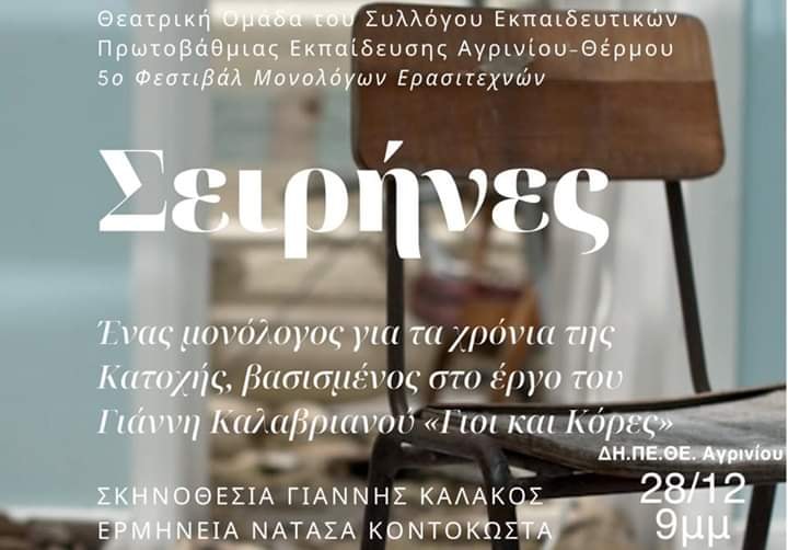 «Σειρήνες», Ένας μονόλογος για τα χρόνια της Κατοχής, βασισμένος στο έργο του Γιάννη Καλαβριανού «Γιοι και κόρες».