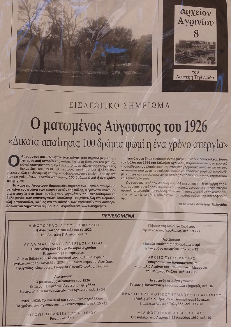 Επίσης, όπως διαβάζουμε στην αρχή του εισαγωγικού σημειώματος, γίνεται αναφορά στο μεγάλο αφιέρωμα που φιλοξενείται στις εσωτερικές σελίδες για «Τον ματωμένο Αύγουστο του 1926» και τους αγώνες των καπνεργατών.