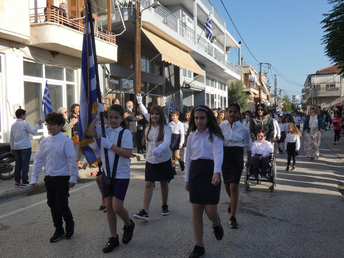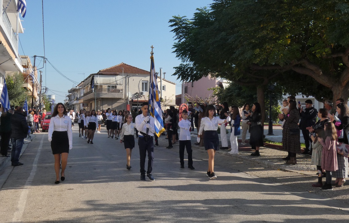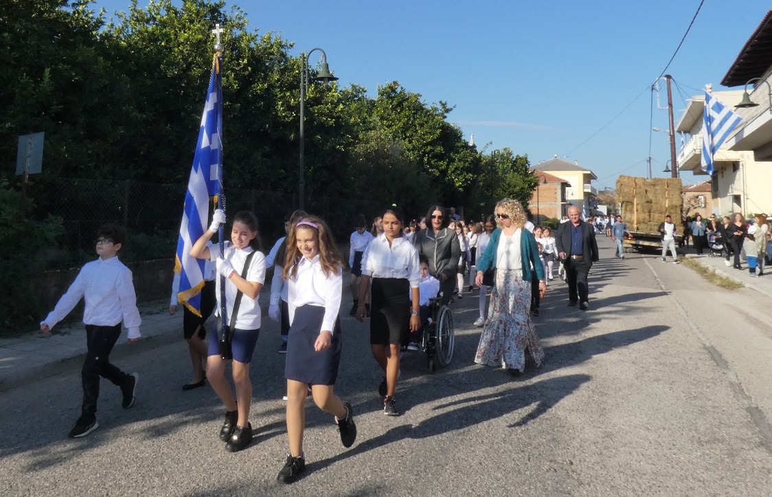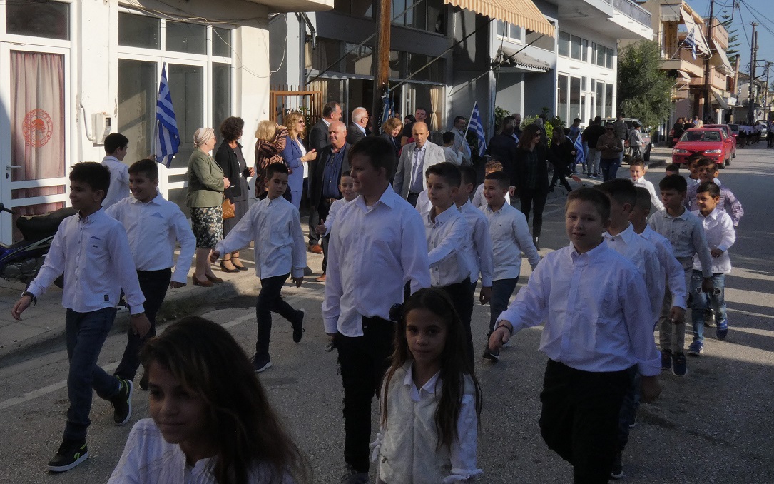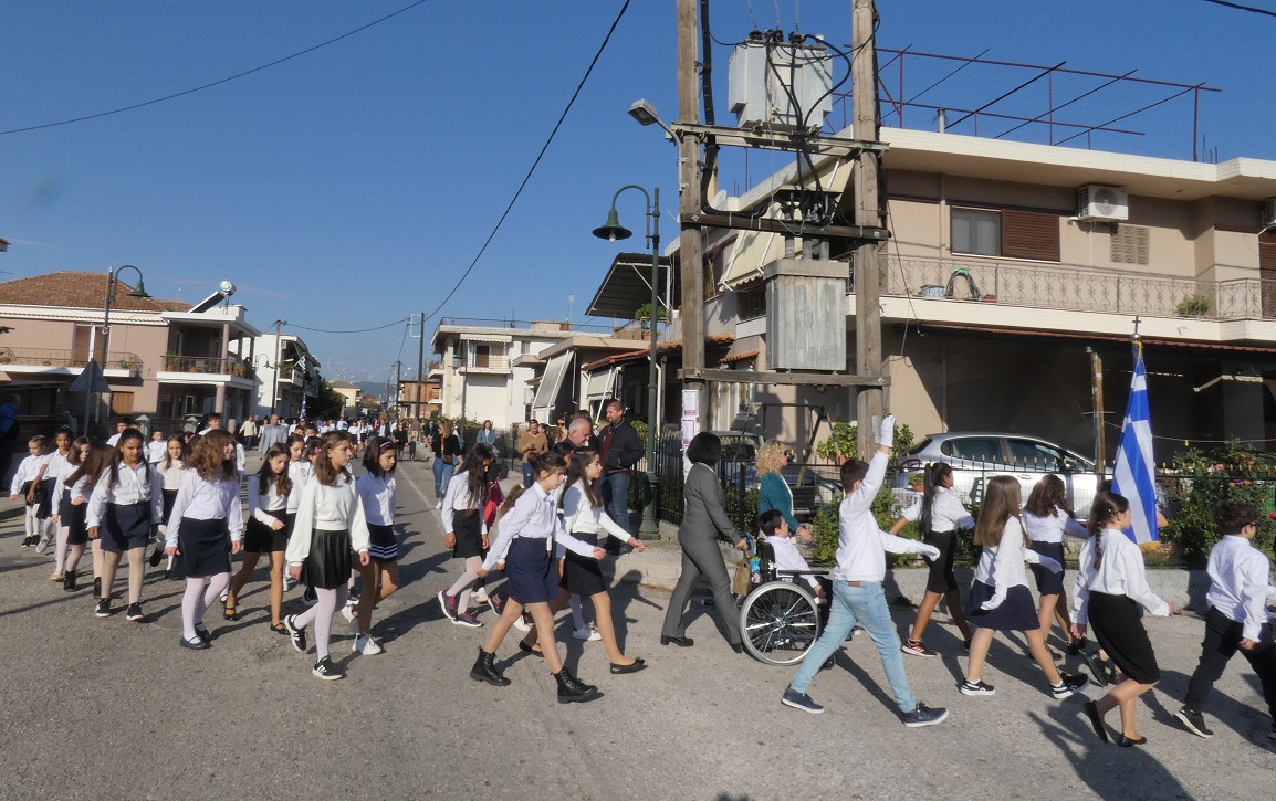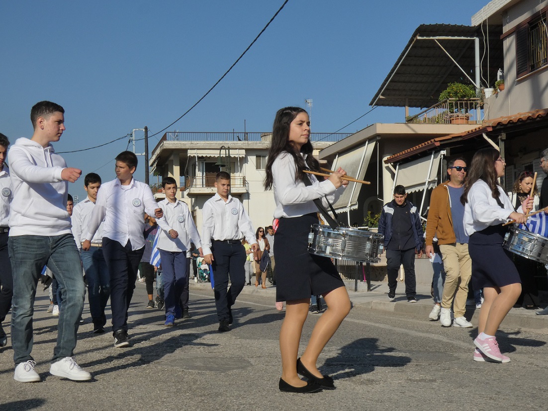 Αμέσως μετά, στους κεντρικούς δρόμους του χωριού μας οι κάτοικοι παρακολούθησαν την παρέλαση των μαθητών του Νηπιαγωγείου, του Δημοτικού Σχολείου και του Γυμνασίου Καλυβίων, για να ολοκληρωθεί η πορεία στο Μνημείο των Πεσόντων, όπου τελέσθηκε η επιμνημόσυνη δέηση για τους πεσόντες υπέρ Πατρίδος.