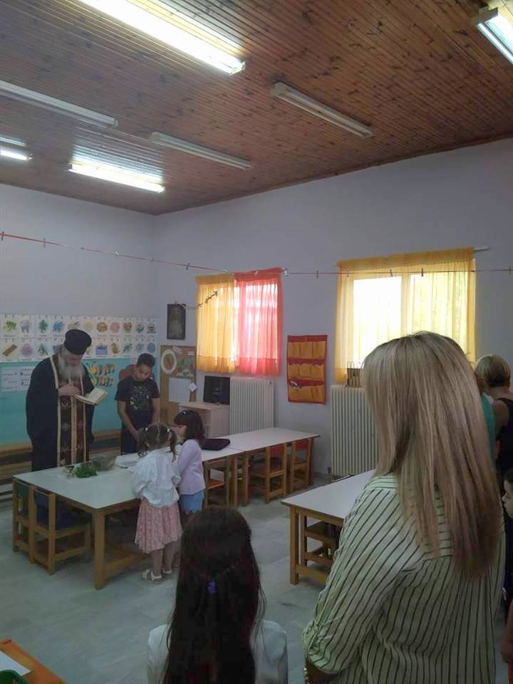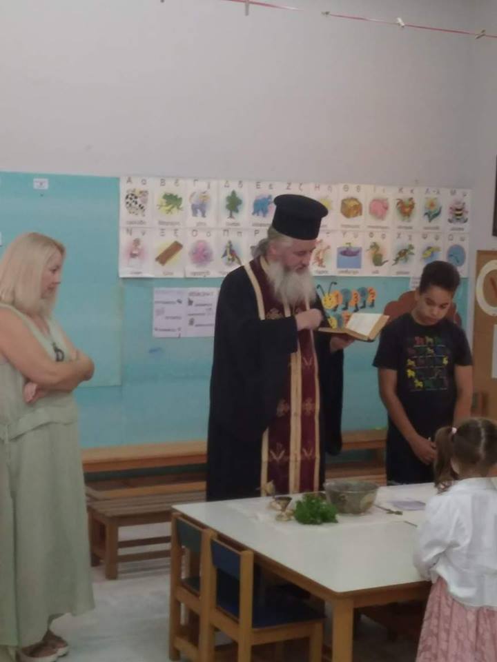 Τον αγιασμό τέλεσε στα σχολεία ο πατήρ Θεοδόσης Αθανασόπουλος, πρώτα στο Νηπιαγωγείο, όπου παρέστη η νηπιαγωγός κα Γιούλα Αυγέρη μαζί με τα 20 παιδιά που έχουν εγγραφεί φέτος, ο Πρόεδρος της Τ.Κ. Καλυβίων, Γρ. Τσελεπής και αρκετοί γονείς.