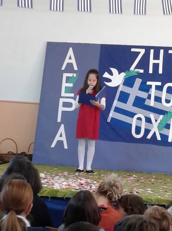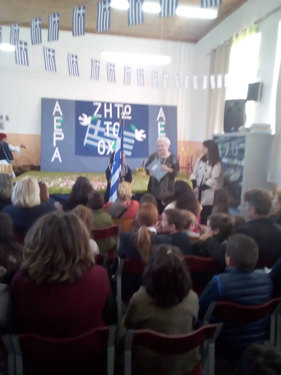Η Διευθύντρια κα Χαρίκλεια Χριστοδούλου, στην ομιλία της αναφέρθηκε στο νόημα και τα μηνύματα της εθνικής επετείου, κατόπιν παρέδωσε τη σημαία για την αυριανή παρέλαση στη σημαιοφόρο Ειρήνη Αναστασίου και στους μαθητές που θα είναι οι παραστάτες, ενώ ακολούθως έγινε η γιορτή με ποιήματα, θεατρικά δρώμενα και τραγούδια από τους μαθητές του σχολείου.