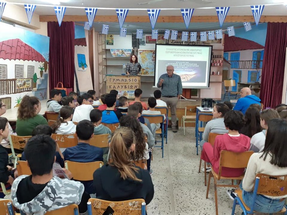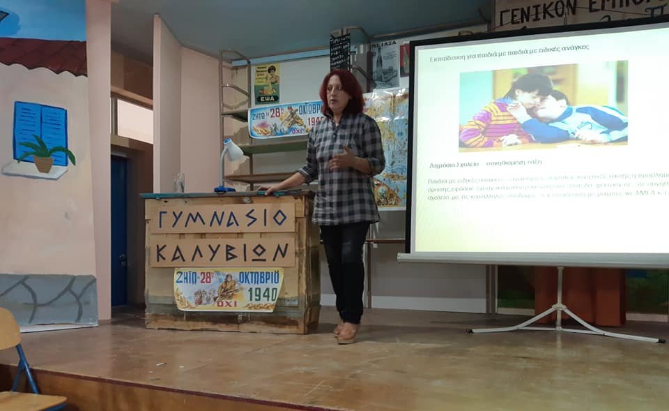 Στην προγραματισμένη αυτή ενημερωτική ομιλία, που είναι εγκεκριμένη από το Υπουργείο Παιδείας, μίλησε ως βασική εισηγήτρια, η Πρόεδρος των ΑΜΕΑ και Κλινική Ψυχολόγος, κα Ελισάβετ Κρητικού Καραμπούλη, και παρουσίασε το θέμα: «Αναπηρίες - Αλληλεγγύη - Προσβασιμότητα - Πρόληψη τροχαίων ατυχημάτων - Εθελοντισμός».