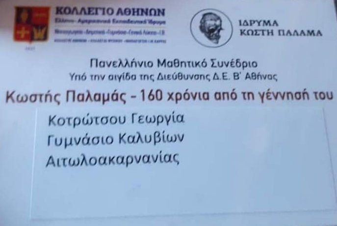 Το διήμερο Πανελλήνιο Συνέδριο (23 & 24/01/2020) έγινε για μαθητές Γυμνασίων και Γενικών Λυκείων, στο πλαίσιο των εορτασμών των 160 χρόνων από τη γέννηση του Κωστή Παλαμά και των 60 χρόνων από τη σύσταση του Ιδρύματος ¨Κωστή Παλαμά¨ διοργανώθηκε από το Γυμνάσιο και το Γενικό Λύκειο του Κολλεγίου Αθηνών, το Γυμνάσιο και το Γενικό Λύκειο του Κολλεγίου Ψυχικού και τελούσε υπό την αιγίδα της Διεύθυνσης Δευτεροβάθμιας Εκπαίδευσης Β’ Αθήνας.