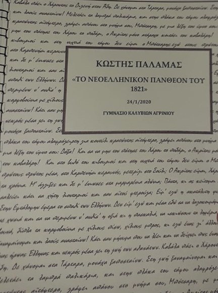 Η επταμελής ομάδα των μαθητριών του Γυμνασίου Καλυβίων συνοδεύονταν από τους εκπαιδευτικούς του σχολείου κυρίες Χρύσω Σπυρέλλη, Θάνια Παπαπαναγιώτου και τον κύριο Ηλία Γοργολίτσα, ενώ η εισήγηση που παρουσίασαν οι μαθήτριες είχε τίτλο: «Ο Παλαμάς για το ¨Νεοελληνικόν Πάνθεον του 1821¨ - Πεζά και ποιήματα».