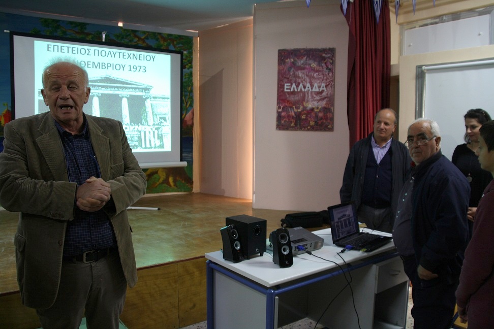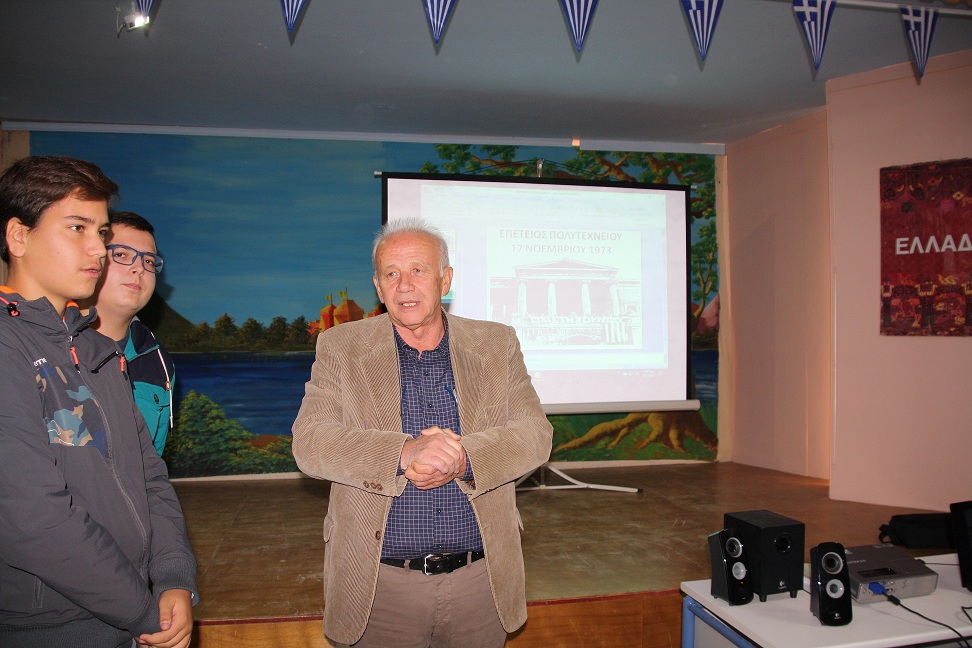 Ο Διευθυντής κ. Ευστάθιος Πίτσας έκανε μια σύντομη αναφορά στη σημασία και το νόημα εκείνων των γεγονότων και στη συνέχεια ο καθηγητής κ. Χρήστος Σταμούλης με φωτογραφικά και κινηματογραφικά αρχεία, παρουσίασε το χρονικό των γεγονότων της φοιτητικής εξέγερσης, ενώ ταυτόχρονα περιέγραφε άγνωστες πτυχές των ιστορικών στιγμών, όπως τις έζησε ο ίδιος μιας και ήταν ένας από τους χιλιάδες πολίτες που έσπευσαν στο Πολυτεχνείο για να στηρίξουν τον αγώνα και τα αιτήματα των φοιτητών ενάντια στη χούντα.