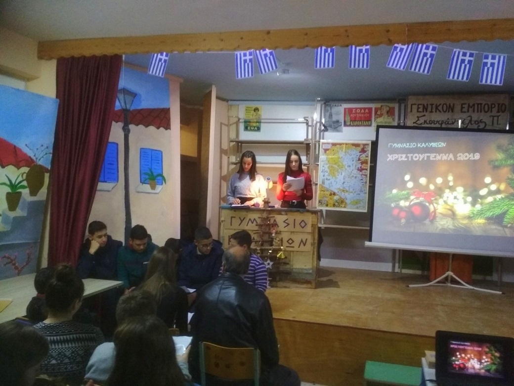 Η Χριστουγεννιάτικη γιορτή του σχολείου πραγματοποιήθηκε τη Δευτέρα στην αίθουσα εκδηλώσεων του Γυμνασίου Καλυβίων και περιελάμβανε χριστουγεννιάτικα τραγούδια, προβολή βίντεο, απαγγελίες κειμένων-ποιημάτων και τα κάλαντα, από μαθητές του σχολείου.