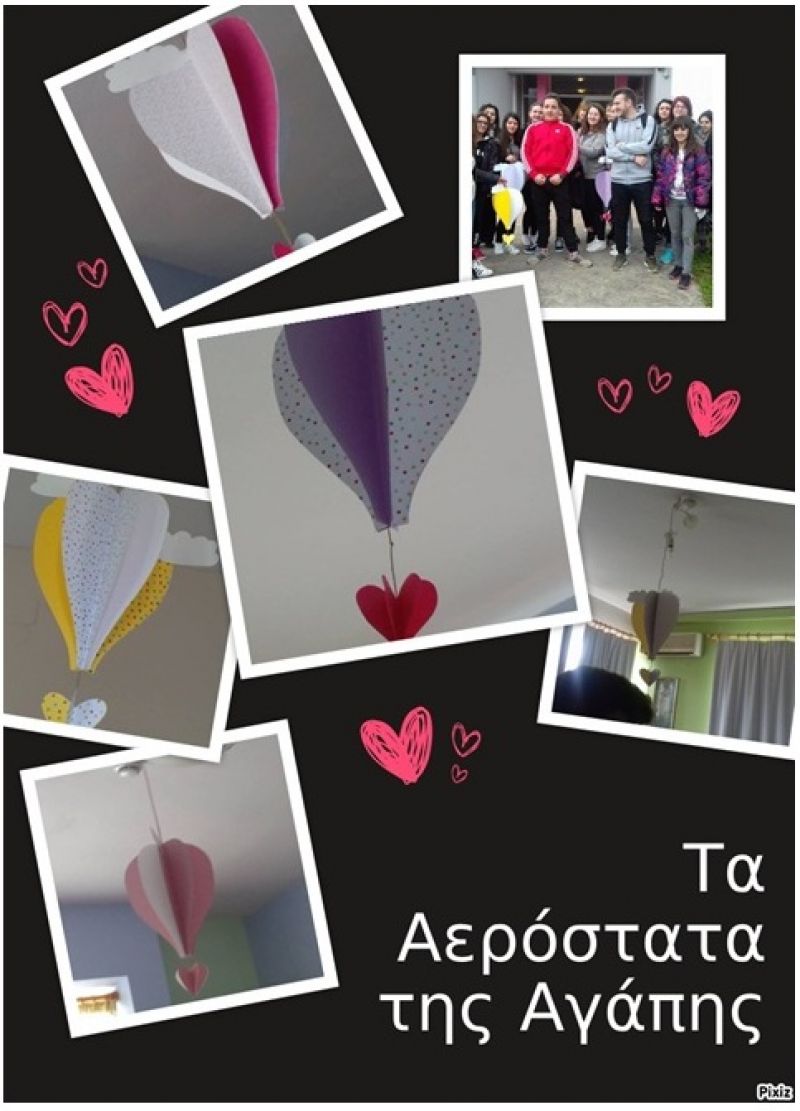 Στις 21/03/2018 οι εκπαιδευτικοί του 2ου ΕΠΑΛ Αγρινίου κα. Ξένου Ευρυδίκη και κα. Γεωργίου Ειρήνη μαζί με τους μαθητές του Β4 Υγείας καθώς και τους μαθητές του προγράμματος «Σχολική Διαμεσολάβηση» επισκέφθηκαν το Σπίτι Ημερήσιας Φροντίδας «Το Χαμόγελο του Παιδιού», στα Καλύβια Αγρινίου, για να παρέμβουν εικαστικά δίνοντας μια ακόμη νότα αγάπης και ανθρωπιάς στολίζοντας το σπίτι με τα Αερόστατα της Αγάπης.