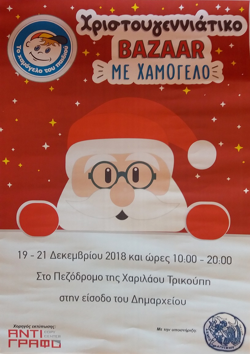 Να θυμίσουμε ότι, το Χριστουγεννιάτικο παζάρι (bazaar) από την Ημερήσια Φροντίδα Καλυβίων Αγρινίου «Το Χαμόγελο του Παιδιού» θα πραγματοποιηθεί στον πεζόδρομο Χαρ. Τρικούπη, στην είσοδο του Δημαρχείου, τις κάτωθι ημέρες και ώρες: