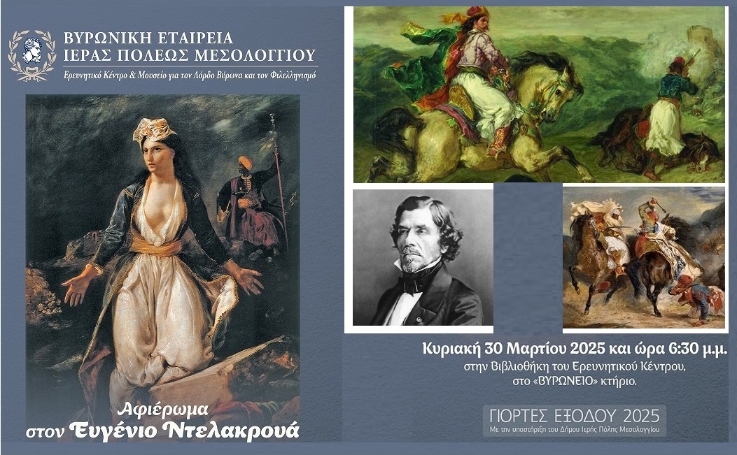 Στο πλαίσιο των Εορτών Εξόδου 2025, η Βυρωνική Εταιρεία Ιερής Πόλης Μεσολογγίου – Ερευνητικό Κέντρο & Μουσείο για τον Λόρδο Βύρωνα και τον Φιλελληνισμό, διοργανώνει μια ξεχωριστή εκδήλωση αφιερωμένη στον Ευγένιο Ντελακρουά, τον μεγάλο Γάλλο ζωγράφο που αποτύπωσε με μοναδικό τρόπο την Ελληνική Επανάσταση και τη θυσία του Μεσολογγίου.