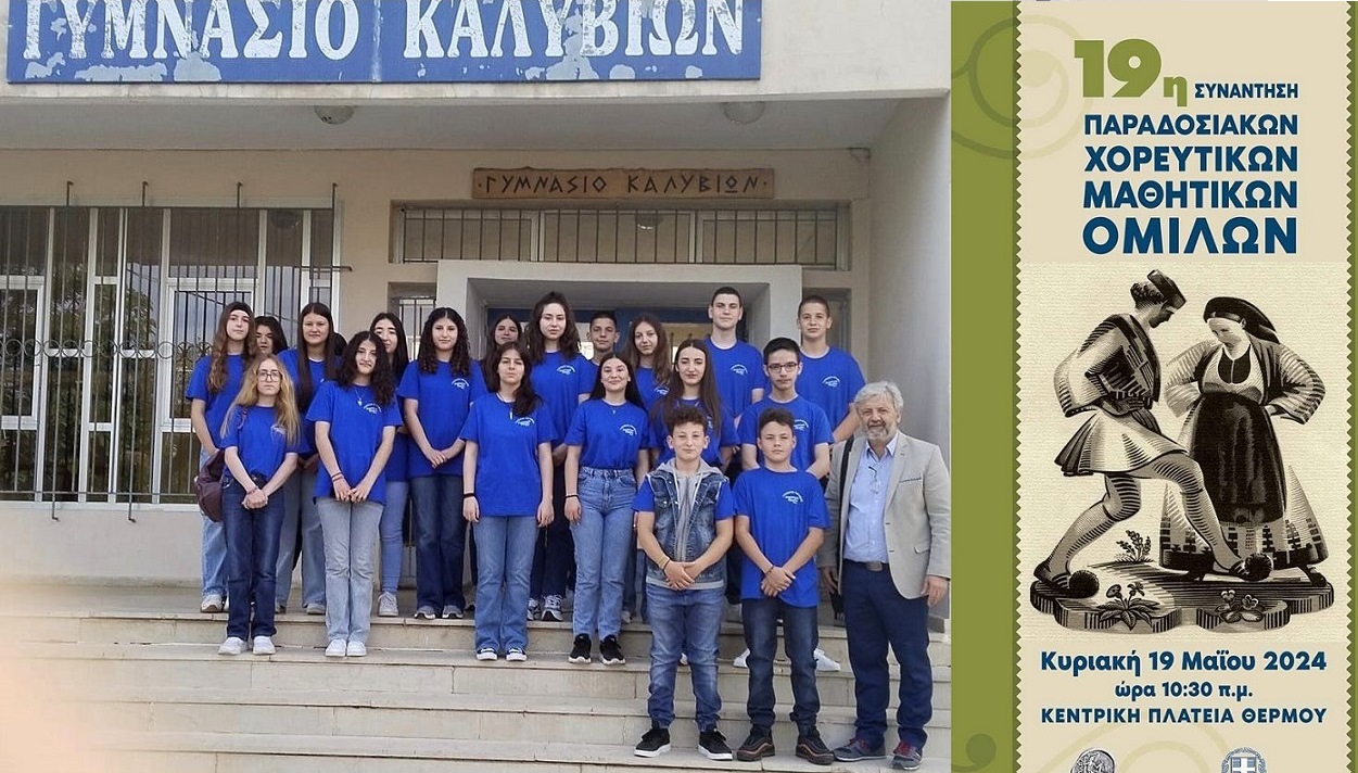 Με μεγάλη επιτυχία πραγματοποιήθηκε το 19ο Μαθητικό Φεστιβάλ Παραδοσιακών Χορών την Κυριακή 19 Μαΐου 2024 στην πλατεία του Θέρμου, όπου συμμετείχε και το Ημερήσιο Γυμνάσιο Καλυβίων, με χορούς της Ηπείρου.