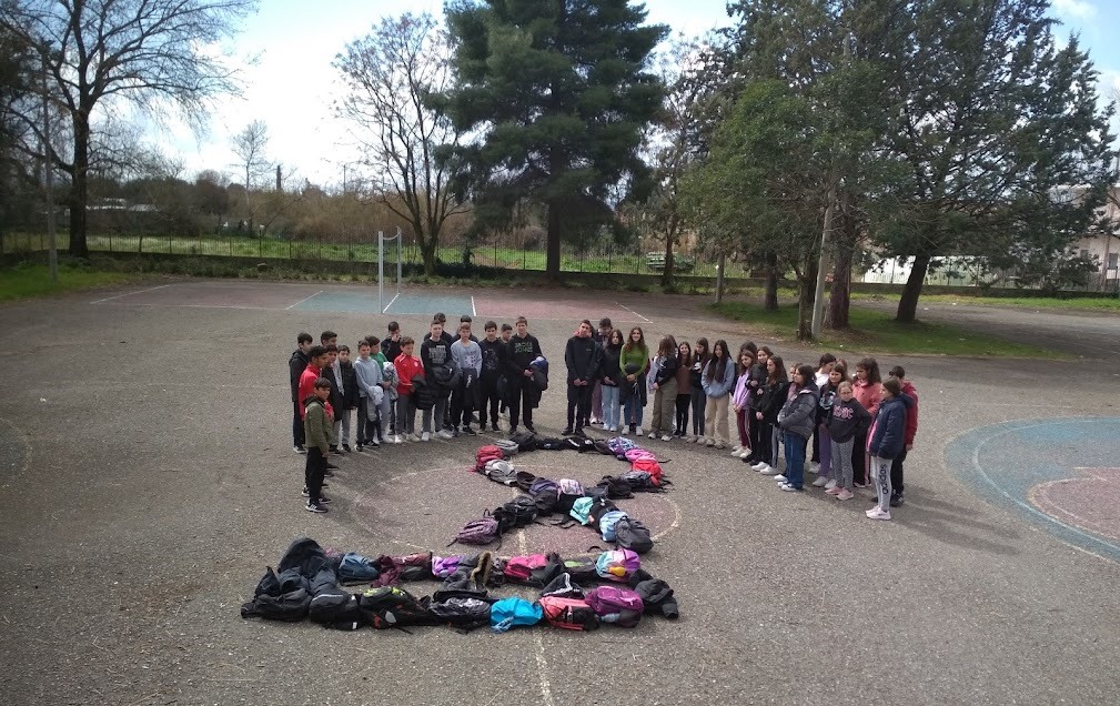 Με μια συμβολικού χαρακτήρα κίνηση, οι μαθητές και οι μαθήτριες του Γυμνασίου Καλυβίων τίμησαν σήμερα, με το σχηματισμό του πένθους με τις σχολικές τσάντες τους και τηρώντας ενός λεπτού σιγής, την μνήμη των άδικα χαμένων θυμάτων στην σιδηροδρομική τραγωδία των Τεμπών.