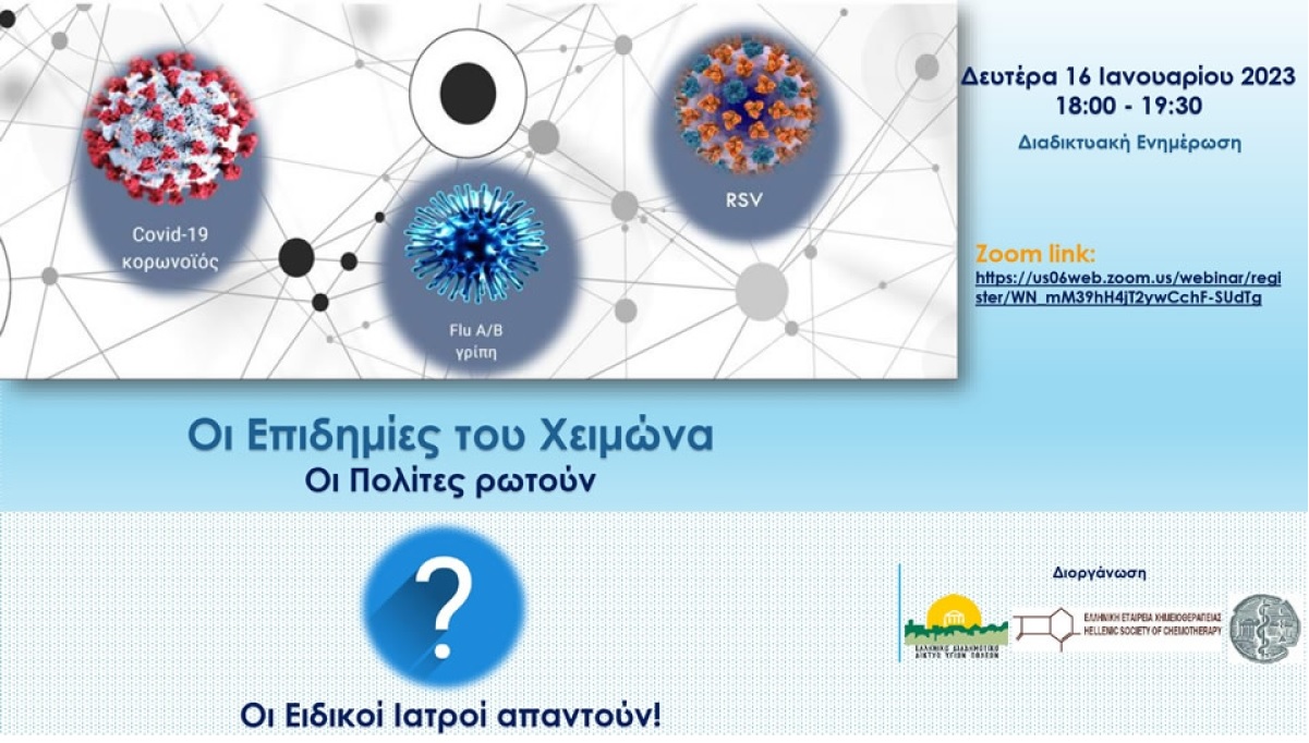 Το Κοινωνικό Ιατρείο και το ΚΕΠ Υγείας της Διεύθυνσης Κοινωνικής Προστασίας και Δημόσιας Υγείας του Δήμου Αγρινίου σας προσκαλεί να συμμετάσχετε, στην ενδιαφέρουσα διαδικτυακή ημερίδα με θέμα: «Οι επιδημίες του χειμώνα - Οι πολίτες ρωτούν, οι ειδικοί Ιατροί απαντούν », την Δευτέρα 16 Ιανουαρίου και ώρα 18:00 μ.μ – 19:30 μ.μ.