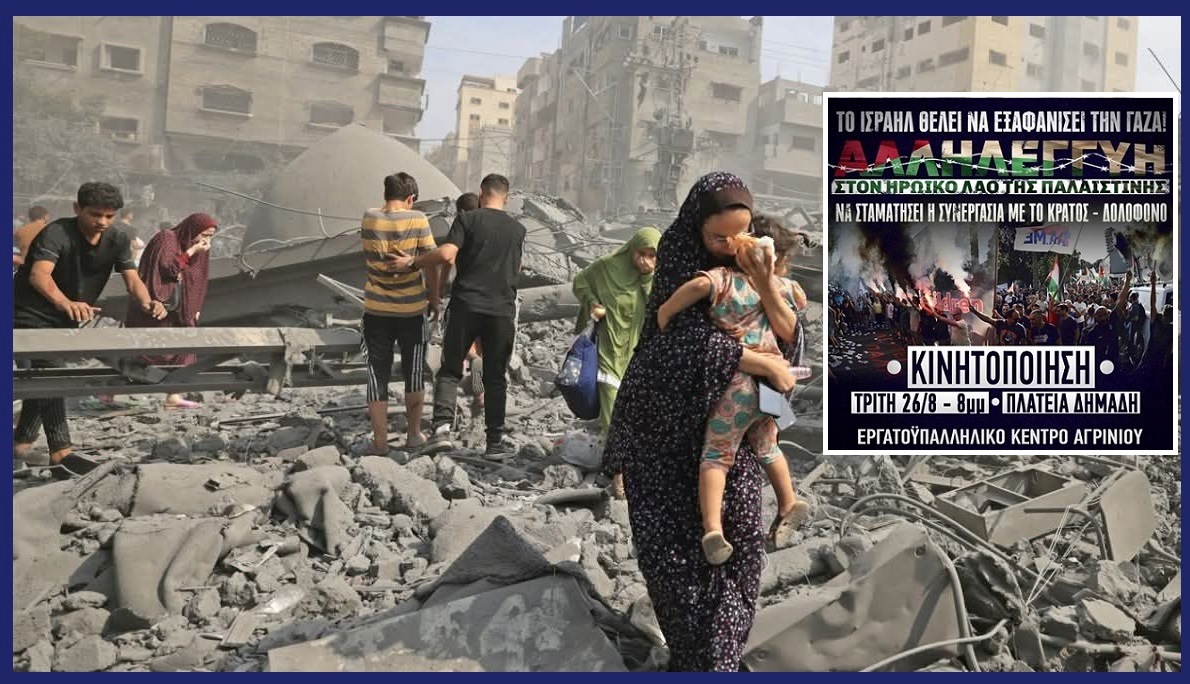 «Την Τρίτη όλοι στις 8 μ.μ. στην πλατεία Δημάδη, ενώνοντας τη φωνή μας με χιλιάδες λαού που διαδηλώνει τις επόμενες μέρες!». Αυτό αναφέρει σε ανακοίνωση-κάλεσμα που εξέδωσε το Εργατικό Κέντρο Αγρινίου, το οποίο διοργανώνει κινητοποίηση ώστε να εκφράσει αλληλεγγύη στον λαό της Παλαιστίνης.